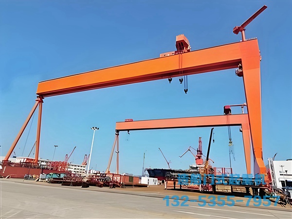 结构框架:采用 “双主梁 + 两端门腿” 的门式结构,主梁多为箱型截面(高强度钢材焊接),门腿底部通过车轮组与地面轨道连接,可沿轨道整体移动(覆盖船坞 / 船台全长),确保作业范围覆盖整个造船区域。